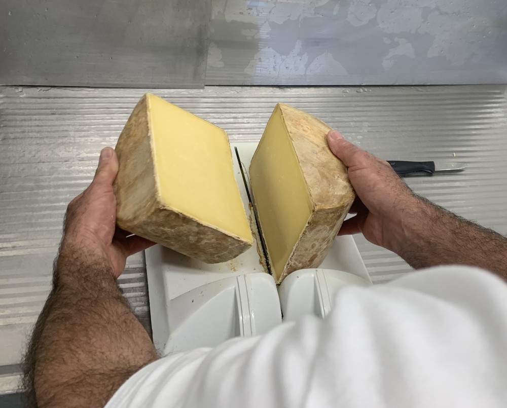 Whilst maturing on pine boards,it is hand turned and rubbed about every 3 weeks,this gives our cheese its distinctive flavour.